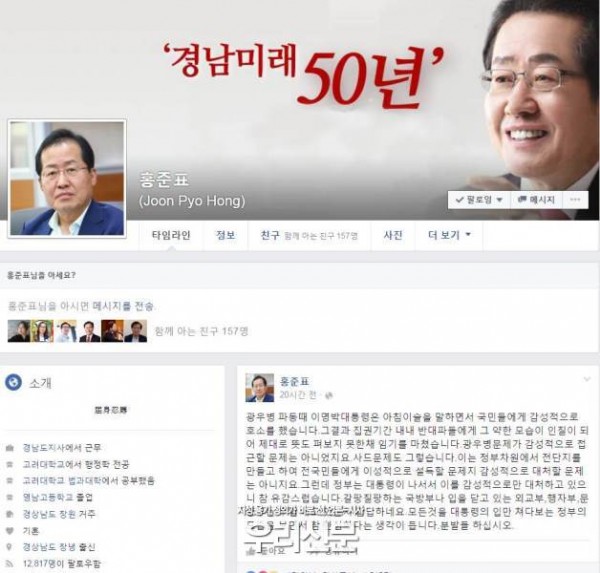 홍준표 지사가 지난 4일 오후 자신의 페이스북을 통해 “사드배치 관련해 정부의 대처해 한심하고 답답하다”고 질타했다.