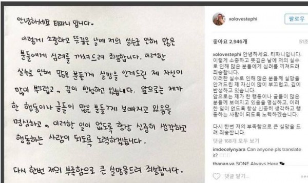 이날 사과문에는"이렇게 소중하고 뜻깊은 날에 저의 실수로 인해 많은 분들에게 심려를 끼쳐드려 죄송합니다"라며 "많은분들께 실망감을 안겨드린 제 자신이 많이 부끄럽고, 깊이 반성하고 있습니다"라고 입장을 전하면서 "앞으로는 제가 한 행동이나 글들이 많은 분들께 보여지고 있음을 명심하고, 이러한 일이 없도록 항상 신중히 생각하고 행동하는 사람이 되도록 노력하겠습니다"며"다시 한번 저의 부족함으로 큰 실망을 드려 죄송합니다"라고 말했다.