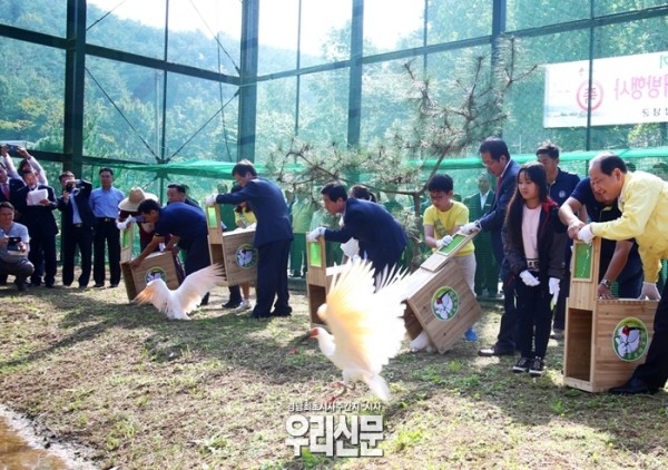 경남도는 우리나라의 하늘과 물가에서 사라진 따오기를 37년 만에 성공적으로 복원하여 처음으로 일반 도민들에게 공개했다.