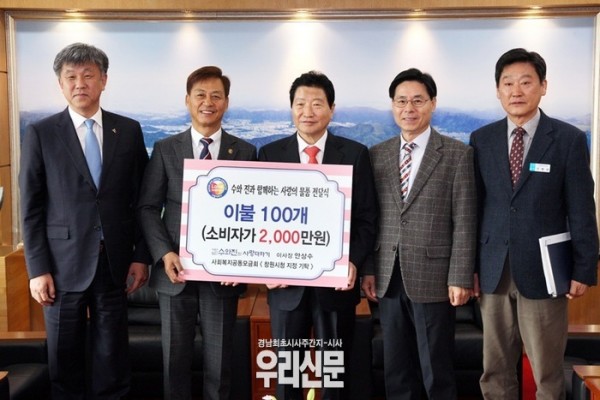 (사)수와진의 사랑더하기(이사장 안상수)는 ‘제16회 마산가고파국화축제’ 기간 동안 펼친 자선공연 수익금으로 마련한 ‘사랑의 이불 100채(환가액 2000만원 상당)’를 연말연시를 맞아 어려운 이웃들이 따뜻한 겨울을 보낼 수 있도록 전달해 달라며, 7일 창원시청을 방문해 안상수 창원시장에게 기탁했다.