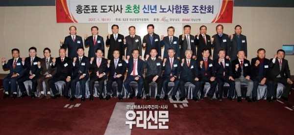 홍준표 도지사는 18일 오전 7시 30분 창원호텔(동백홀)에서 경남경영자총협회의 주관으로 개최된 노사합동 신년조찬회에 참석하여 도내 최고경영자 및 노조간부를 대상으로 ‘경남미래 50년과 대한민국의 미래’라는 주제로 특강을 실시하였다.