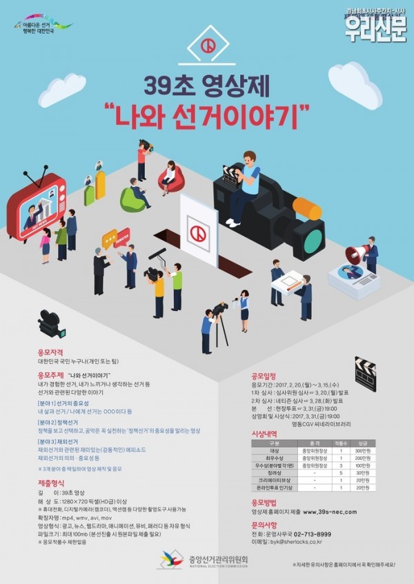 창원시마산합포구선거관리위원회는 제19대 대통령선거를 앞두고 유권자가 선거에 참여하는 주체라는 인식을 높이고 모두가 화합‧소통하는 선거문화를 만들기 위하여「39초 영상제, “나와 선거이야기”」공모전을 중앙선거관리위원회가 개최한다고 밝혔다.