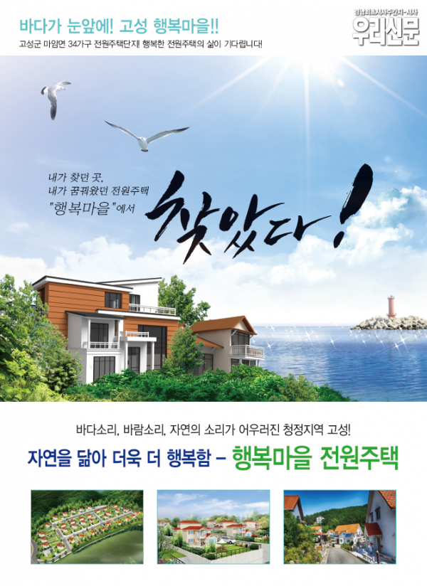탁 트인 바다가 배경이 되는 곳, 광역 교통망이 연결되어 전국을 내 집처럼 다닐 수 있는 곳, 고성 행복마을은 고성의 아름다운 자연은 물론 고성의 눈부신 미래가치까지 보장받은 최고의 전원주택지입니다.