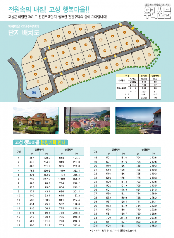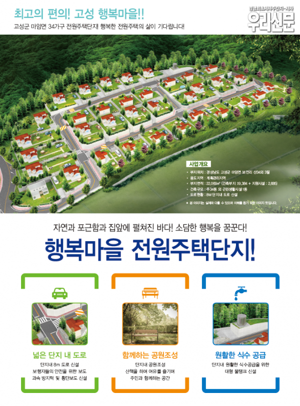 고성 최대 규모의 전원주택 단지로 조성되는 고성 ‘행복마을’은 주택법에 의거한 대지조성사업으로 개발되었습니다. 주거공간으로서의 안전성을 확보하였으며, 고생 행복마을은 개별 입지로 개별되는 전원주택단지의 통상적인 인,허가 문제를 불편함 없이 깔끔하게 해소하였습니다.