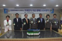 ▲ (좌측부터 이유정 창원시 환경수도담당 / 이춘수 창원시 환경정책과장 / 황진용 창원시 환경녹지국장 / 이수능 무학 대표이사 / 조덕환 좋은데이나눔재단 이사 /  김영남 무학 주류연구소장 / 이기주 무학 그룹관리팀장 무학, 창원시와 미세먼지 저감 캠페인 MOU 체결- 딱 좋은데이 300만 병에 ‘미세먼지 저감 실천~’ 문구 삽입(경남소상공인신문=창원...