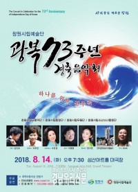 창원시립예술단 <2018광복음악회>가 오는 8월 14일 오후 7시 30분 성산아트홀 대극장에서 열린다.   이번 공연은 광복 73주년을 기념하고 평화와 통일을 염원하기 위해 ‘하나를 위한 전주곡’이라는 주제로 열린다. 창원시립교향악단, 창원시립합창단, 창원시립무용단, 창원시립소년소녀합창단이 출연하고 소프라노 오은경, 테너 지명훈, 피아니스트 이주...