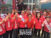 자유한국당 나경원 의원이 6.13지방 선거 9일을 앞둔 4일 오전 11시, 한국전쟁 당시, 자유대한민국의 최후 방어선인 낙동강 변에 위치한 창녕군 이방면 이방장터를 찾아 지원유세를 펼쳤다. ▲한정우 창녕군수등 한국당 후보 지원 유세를 마친 나경원(앞줄 우측에서 두번째)의원이 후보들과 함께 승리의 2번을 손가락으로 표시하고 있다.     ©경남우리신문 편...