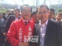 경남 창녕군수 자유한국당 한정우 후보가 13일 오후 4시 '6·13 지방선거 필승 선거사무소 개소식'을 열고 본격적인 세몰이에 나섰다.   ▲경선방식을 두고 이견을 보였던 김부영 도의원이 한정우 후보 개소식에 참석해 손을 맞잡고 환한 웃음을 짓고 있다. 김 의원은 이날 사실상의 한정우 후보 지지를 선언했다.     ©경남우리신문 편집국     이날 창...