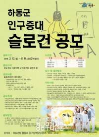 하동군이 살기 좋은 도시 조성의 방향과 비전을 함축적으로 내포할 수 있는 슬로건을 발굴하고자 ‘하동군 인구증대 슬로건 공모전’을 개최한다고 29일 밝혔다.이번 공모전에는 저출산·고령화, 일자리, 결혼, 양육, 교육, 귀농·귀촌 등 하동군의 인구정책에 관심이 있는 사람이면 누구나 참여할 수 있다.공모할 슬로건은 간결하고 이해하기 쉬우며, 구호형태의 짧은 한글...