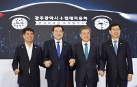 ▲  문재인 대통령이 31일 오후 광주시청 1층 시민홀에서 열린 ‘광주광역시-현대자동차 투자협약식’에서 윤종해 한국노총 광주본부장, 이용섭 광주광역시장, 이원희 현대자동차 대표이사(왼쪽부터)와 손을 잡고 기념촬영을 하고 있다. (사진=광주광역시 광주시-현대차, 완성차 공장 합작법인 투자협약 체결 - 사회적 대타협 기반 노·사 상생의 사회통합형 일자리 ...