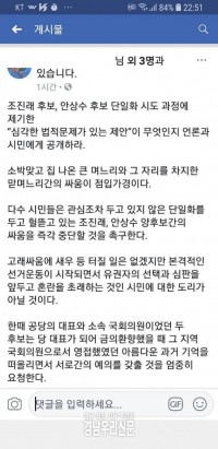 바른미래당 창원시장 정규헌 후보 선거대책위원회는 1일 성명서를 통해 "조진래 후보, 안상수 후보 단일화 시도 과정에 제기한'심각한 법적문제가 있는 제안'이 무엇인지 언론과 시민에게 공개하라"고 촉구했다.   ▲     ©경남우리신문 편집국 정 후보 선대위는 "소박맞고 집 나온 큰 며느리와 그 자리를 차지한 맏며느리간의 싸움이 점입가경이다"며"다수 시민...