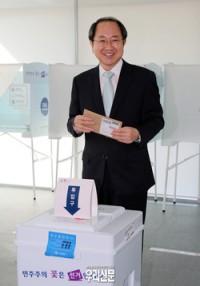류순현 도지사 권한대행은 제19대 대통령선거 사전투표일인 4일 오전 8시에 창원시 의창구 창원문화원 1층 전시실에 마련된 용지동사전투표소를 찾아 소중한 한 표를 행사했다.   투표소를 찾은 류 권한대행은 투표사무종사원에게 먼저 신분확인을 받고, 투표용지와 회송용 봉투를 수령하여 기표소에서 기표 후 투표를 실시했다.   ▲ 류순현 도지사 권한대행, ...