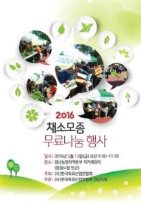 (사)한국육묘산업연합회 경남지회는 13일 오전 9시 30분 창원시 의창구 경남농협지역본부 직거래장터에서 채소모종을 무료로 나눠준다.   이날 배부될 모종은 수박, 오이, 가지, 고추, 상추 호박 등 10만주로, 경남 17곳 육묘장에서 생산한 것들이다.   도시농업의 이해와 공감대 확산 및 가정원예 활성화를 위해 개최되는 ‘채소모종 무료 나눔행사’는 (사)...