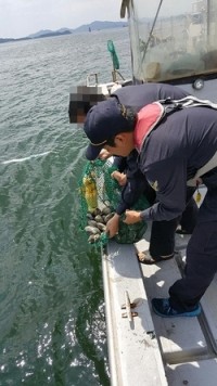 ▲ 창원해경이 불법으로 채취된 개조개를 바다에 방류중이다     ©경남우리신문편집국 창원해양경비안전서(서장 김영모)는 21일 오전 진해 소율도 인근해상에서 허가 없이 개조개를 채취한 김모씨(67세)를 적발했다고 22일 밝혔다.     21일 오전 9시 40분께 신고를 받고 진해 소율도 인근 해상으로 출동한 창원해경 P-01정은 허가 없이 개조개 약 2...