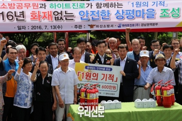 창원소방본부는 13일 오후 2시 마산합포구 진전면 상평마을에서 하이트진로 경남권역본부와 기부협약으로 맺은 ‘1원의 기적’ 모금액으로 ‘화재 없는 안전마을 조성’ 행사를 실시했다.