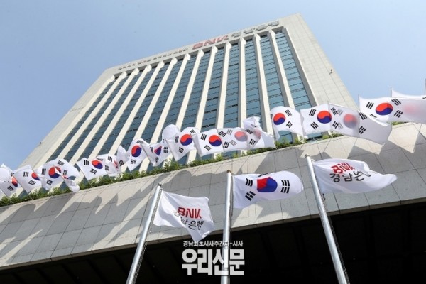 BNK경남은행 본점 앞이 태극기 물결로 뒤덮였다.