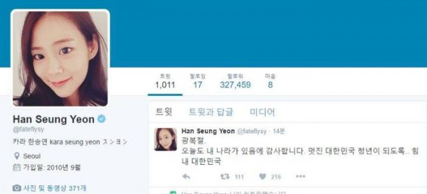 이와 관련 SNS상에 올려진 글에는 대한민국 연엔이라면 이정돈 되야지..."라며"일본 공연도중 욱일승천기를 이빨로 찢어버린 '노브레인'과 오늘은 광복절 내나라가 있어 자랑스럽다는 '카라' 이제 소녀시대 그만 빨고 노브레인 카라 합시다...ㅋ"라고 게재됐다.