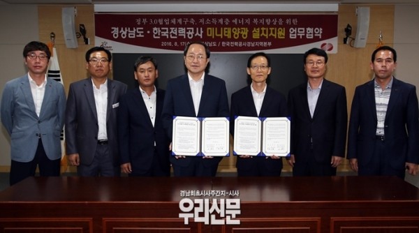경남도는 한국전력공사 경남본부(본부장 고원근)와 17일 경남도청에서 저소득계층 미니태양광 무상 설치 지원을 위한 업무협약을 맺고 도내 저소득계층의 에너지 복지향상을 통한 도민편의 증진에 공동 노력하기로 협의했다.