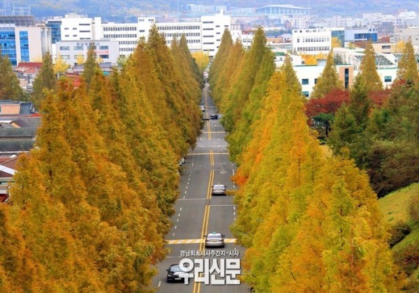 창원 용지로 도심 속 메타세쿼이어 가로수길이 만추(晩秋)의 거리로 변하면서 사람들을 추억속의 잊혀진 정거장으로 안내하고 있다. 울긋불긋 단풍이 절정을 이룬 도심을 걷다보면 어느새 사색과 낭만에 젖어든다. 그리고 그 길에 내려앉은 낙엽 밟는 소리에 교과서에 실렸던 시 한 수를 반추하는 여유를 가지며 진한 원두커피향을 그리워한다.