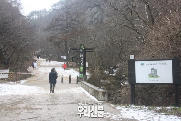 주왕산 주산지 입구 눈이 내려 아직 녹지 않은 설운을 기대하며 발길을 제촉했다.