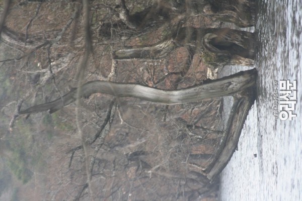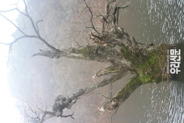 주산지 비문석을 마주하고 바라본 주산지 풍광은 겨울을 맞이하듯 앙상한 나뭇가지만이 훤한 속살을 드러내며 주위와 조화를 이루며 추위를 기다리고 있는 듯했다.현실세계가 아닌 사계절을 담은 영화속 주산지는 인간의 편의 시설 제공이라는 명목아래 데크로드가 조성됐고 왕버들 나무가 호수에 반사되는 사진을 렌즈에 담기에는 거리가 멀었다.