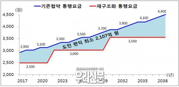 기존 실시협약에 따르면 매년 물가상승률(2.0% 가정)을 반영하여 요금을 인상하도록 되어 있어, 이에 따라 소형차 기준 협약통행료는 4,400원까지 인상되는 구조였으나 이번 재구조화 합의를 통해 매 8년 마다 500원 인상하도록 조정하여 최대 3,500원으로 900원의 인하효과가 발생된다.