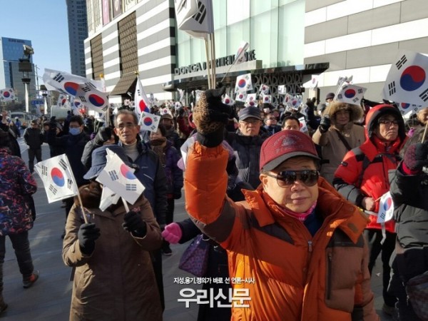 이날 탄핵반대 집회는 올 들어 가장 추운 한파였지만 참여한 국민들은 박근혜 탄핵반대와 무효를 외치고 태극기를 흔들며 간절한 마음으로 애국가를 불렀다.나라사랑은 추위를 녹이는 집회의 열기로 후끈했다.
