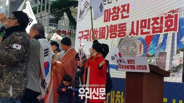 구국 시민집회는 개회선언과 국민의례 천만수 집행위원장의 인사말과 함께 연사들의 결의사가 낭독됐고 태극기 물결은 고조됐다. 호산스님(사단법인 대한호국불교 경남승병단 단장)의 결의사를 시작으로 김은영(시사우리신문 국회출입 정치본부장)의 결의문 낭독에 마산시민들은 열광하게 했고 태극기 물결은 최고조에 달했다. 자유민주주의 수호를 위해 3.15정신과 혼으로 뭉친 단결된 태극물결은 테블릿PC,JTBC언론조작,고영태 구속,특검 해체,탄핵반대 등을 강력히 촉구했다.