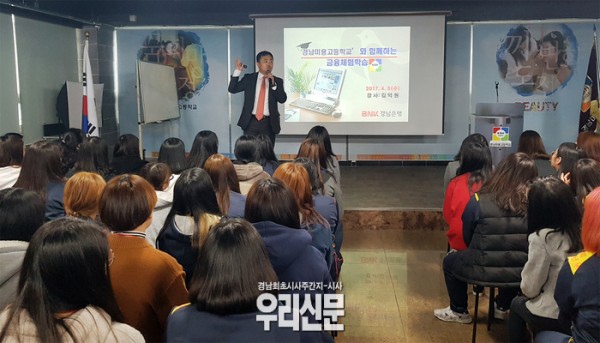 경남미용고등학교(창원시 마산회원구 봉암동 소재) 강당에서 진행된 찾아가는 금융교육에는 1학년 학생 100여명이 참석했다.
