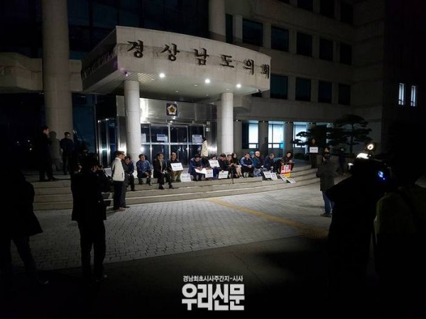 이날 9시, 더불어민주당·정의당 당직자와 당원들이 경남도의회 앞에서 정당 연설회를 개처최하면서 '꼼수 정치 이제 그만', '홍준표는 정계를 떠나라' 라는 손팻말과 피켓을 들고 도의회 현관 앞을 지켰다.