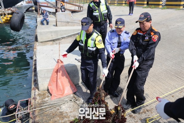 창원해경 김성룡 경비구조과장과 김성중 구조협회장은 직접 쓰레기를 치우며 동참했고, 구조협회 소속 잠수부들은 바다 속으로 들어가 수중쓰레기와 해상부유물을 수거했다.
