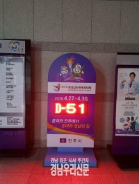 진주시가 도민체전 개최 분위기 조성에 본격적으로 나선다. ▲제57회 도민체전 D-50일 전     ©경남우리신문 편집국 진주시는 오전 시청 1층 로비에 도민체전 잔여일수기를 설치했다고 밝혔다.잔여일수기는 '뭉쳐라 진주에서 솟아라 경남의 힘'이란 슬로건 아래 오는 4월 27일부터 4일간 진주시와 7개 시·군에서 분산 개최되는 제57회 경상남도민체육대회의 ...