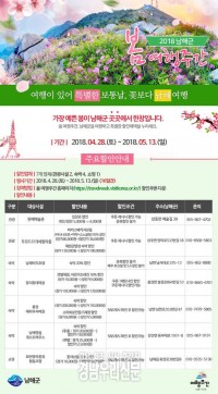 천혜의 관광자원을 보유한 보물섬 남해군이 지역관광을 통한 내수경제 활성화를 위해 실시하는 ‘2018 봄 여행주간’을 맞아 다채로운 할인 혜택을 마련했다.군에 따르면 ‘여행이 있어 특별한 보통날, 꽃보다 남해여행’을 주제로 지난 28일부터 오는 5월13일까지 16일간 ‘2018 남해군 봄 여행주간’ 맞아 관광, 숙박, 쇼핑시설을 할인 운영한다. ▲봄 여행주...
