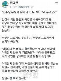 바른미래당 사회적경제위원장인 정규헌 창원시장 후보가 더불어 민주당 우원식 원내대표에게 "무엇이 그리 두려운가?"라며 국회 정상화를 촉구하고 글을 SNS 인스타그램에 게재했다. ▲정규헌 창원시장 후보,더불어 민주당 우원식 원내대표에게 "무엇이 그리 두려운가?"라며 국회 정상화 촉구!     ©경남우리신문 편집국 정규헌 위원장은 6.13 지방선거 경남도지...