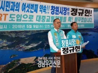 바른미래당 정규헌 창원시장 후보가 9일 오전 창원시청 프레스센터에서 기자회견을 열고 6번째 공약인 “GRT, BRT 도입으로 대중교통체계를 확 바꾸겠다”고 공약했다.    ▲정규헌 창원시장 후보,“GRT, BRT 도입으로 대중교통체계를 확 바꾸겠다”고 공약     ©경남우리신문 편집국 정 후보는 "재정건전성 악화 우려로 중단된 창원 도시철도 건설사업과...