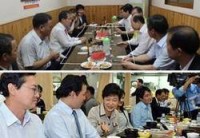 ▲ 고향 창녕을 방문한 홍준표 지사 2명이 앉아 먹는 식탁에 혼자 널널하게 앉아 있는 모습(위)이 지난 2012년 10월 금융계종사자와 촘촘히 앉아 먹는 박근혜 대통령(당시 대선후보)의 모습과 대조적이다.(아래사진-출처=뉴스1)     © 경남시사우리신문편집국[시사우리신문=새창녕신문]홍준표 지사가  경남 MBC가 보도한 '지난 지방선거 경선과정에서 측근이...