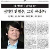 “국민 삶을 중요하게 여기는 ‘낮은 정치’ 시작하기 위해서” 출마키로안철수의 존재감만으로도 폭발적인 수준으로 여야 긴장 민주당- 여전히 안 전 후보의 동향만 파악 중 새누리당- 기초단체장 무공천 논란 4.24 서울 노원병 재보궐 선거에 출마 한 안철수 전 무소속 대선후보가 지난 11 일 한국으로 돌아왔다. 지난해 대선 당일인 12월 19일 미국으로 떠난지 ...