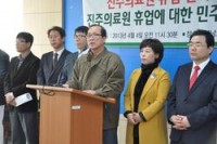 장영달 경남도당 위원장님과 16개 지역위원장장님이 4일 오전 11시 30분 경남도청 프레스센터에서 기자회견을 열고 '진주의료원 불법 휴업 즉각 철회'를 촉구했다. 기자회견 후 홍준표 지사와 면담을 요구했으나 이뤄지지 않아 오후 1시 20분 현재 도청 현관 정문에서 야전침대를 펼쳐놓고 농성을 벌이고 있다. 다음은 기자회견문 전문 경남도가 지역사회의 거센 반발...