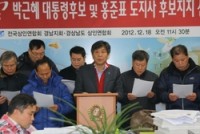 전국상인연합회 경남지회(조용식 회장)회원은 18일 오전 11시30분 경남도의회 프레스쎈터에서 기자회견을 통해 새누리당 박근혜 대선후보와 홍준표 경남지사 후보 지지를 공식 선언했다.경상남도상인연합회 조용식 회장은 기자회견을 통해 "18개 시군 회장 및 회원들은 제18대 대통령 선거와 경상남도지사 보궐선거를 임하면서 박근혜 새누리당 대통령후보와 홍준표 새누리당...