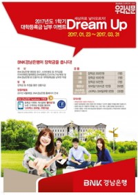 BNK경남은행은 대학(교) 등록금 납부 기간을 맞아 오는 3월말까지 ‘2017년 1학기 대학 등록금 납부 이벤트’를 진행하고 있다.   BNK경남은행과 등록금 수납계약이 체결된 경남ㆍ울산ㆍ부산지역 대학(교) 재학생(신입생ㆍ복학생ㆍ대학원생 포함)이 BNK경남은행 영업점 창구와 전자금융(인터넷뱅킹ㆍ텔레뱅킹ㆍ스마트뱅킹ㆍCD/ATMㆍ가상계좌) 그리고 경남BC신용카...