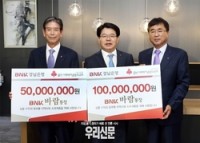 BNK경남은행은 BNK금융그룹 계열사인 BNK부산은행과 공동으로 경남사회복지공동모금회(회장 한철수)와 울산사회복지공동모금회(회장 김상만) 그리고 부산사회복지공동모금회(회장 신정택)에 BNK바람통장ㆍBNK단비통장 기부금을 기탁했다.  ▲ BNK경남은행 손교덕 은행장(사진 가운데)이 경남사회복지공동모금회 한철수 회장(사진 오른쪽 첫번째)과 울산사회복지공동모금회...