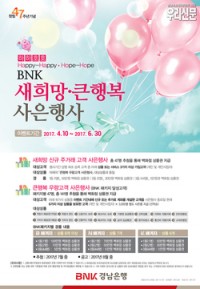 BNK경남은행은 창립 47주년을 기념해 오는 6월 30일까지 ‘BNK 새희망ㆍ큰행복 사은행사’를 진행한다.   BNK경남은행에 최초 등록한 고객이 금융상품과 금융서비스 16종 가운데 3종 이상 가입하면 47명을 추첨해 백화점 상품권 50만원권(1등 1명), 백화점 상품권 30만원권(2등 2명), 백화점 상품권 5만원권(3등 44명)을 준다.   금융상품과 ...